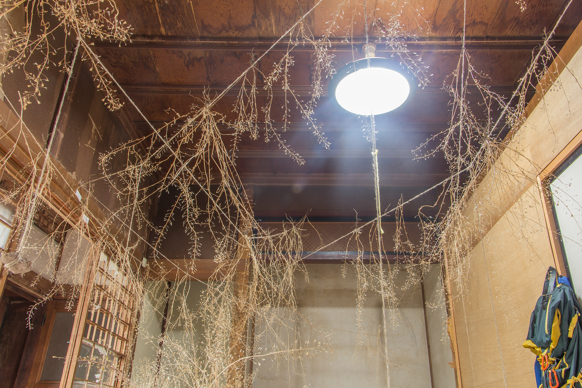 This site-specific installation accumulates found natural and domestic materials from the local environment in Hokkaido, examining them through observational drawings while constructing a 'nesting' habitat. The housing traditional room, overlooking a Japanese garden, resembles a solarium; where decaying materials seek refuge and are being tended on in hope of revitalization. The environment grows, dissects, and fluctuates over the course of my stay there, and behaves like an organic organism or ecosystem itself.
