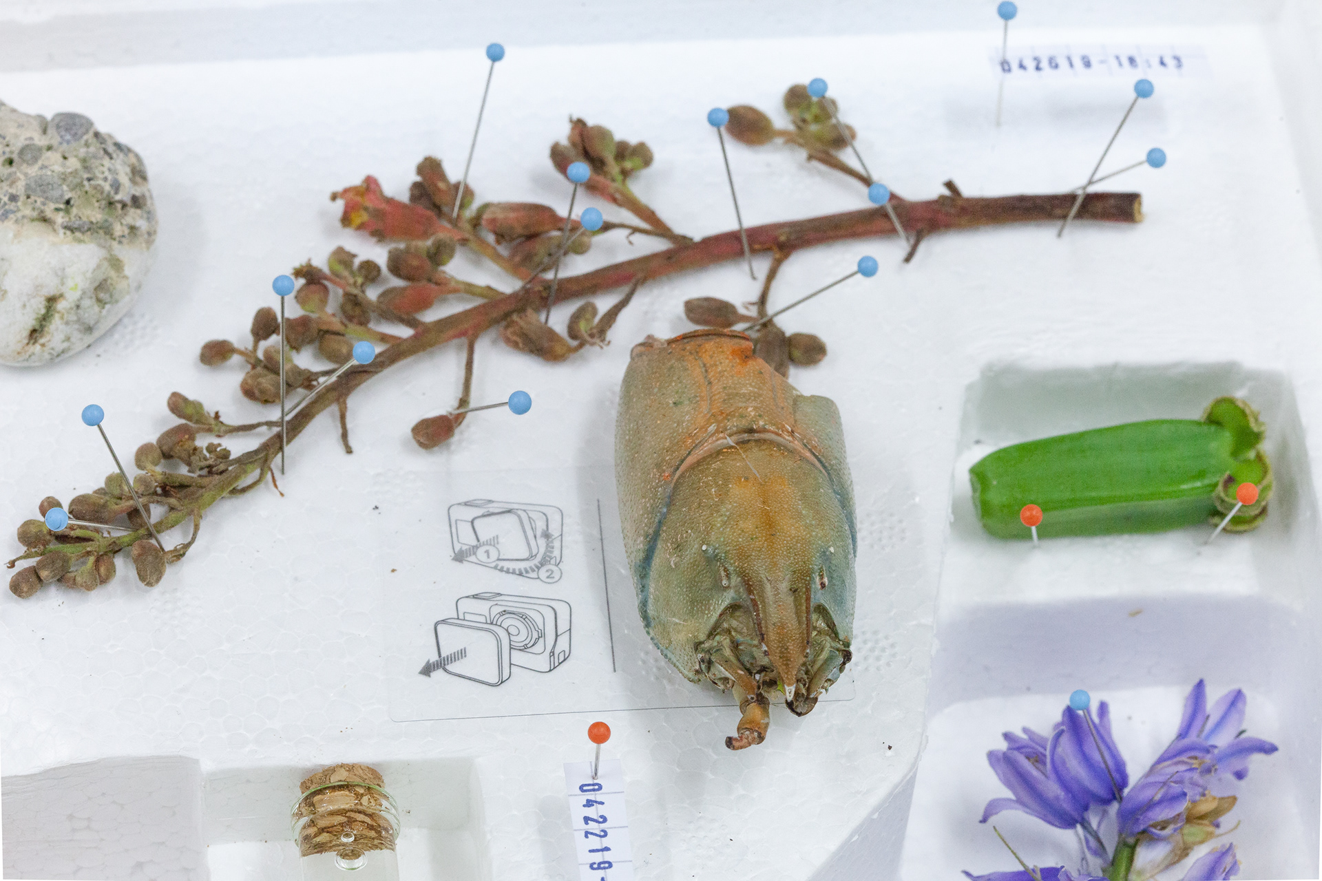 Remnants and relics of collected materials during my stay at La Becque; fitted in cavities of discarded styrofoam.